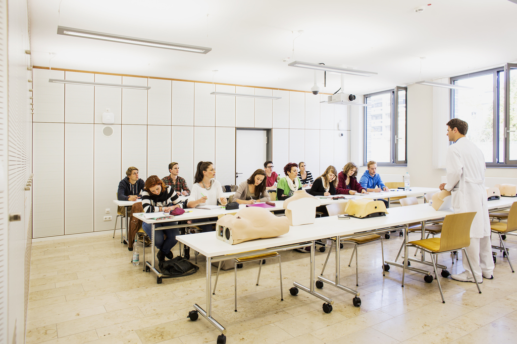 Neben einem großen Hörsaal stehen 18 Seminarräume für den Unterricht in Kleingruppen zur Verfügung – darunter sechs, die über riesige Spiegel zu insgesamt drei Doppelräumen verbunden sind. Ähnlich, wie man es aus dem abendlichen Fernsehkrimi kennt, stehen hier Studierende und Lehrende auf der einen Seite des Spiegels und verfolgen das Geschehen im anderen Raum. Dabei beobachten sie in der Regel Untersuchungs- und Behandlungssituationen mit Simulations-Patienten des Simulations-Patienten-Programm. Durch die räumliche Trennung ist gewährleistet, dass die Übungen möglichst authentisch ablaufen. So können angehende Ärztinnen und Ärzte die Kommunikation mit Patient:innen unter realistischen Bedingungen trainieren. Darüber hinaus verfügt das neue Gebäude über ein modernes und gut ausgestattetes "Skillslab" mit sechs eigenen Räumen, in denen die Studierenden die Handgriffe ihres zukünftigen Berufsalltags einüben. Eine besondere Lernerfahrung ermöglicht die „Sim-Arena": Hier ist die Simulation realitätsnaher Einsatzszenarien auf einer halbrunden, 270 Grad umspannenden Leinwand mit Bild und Ton möglich.