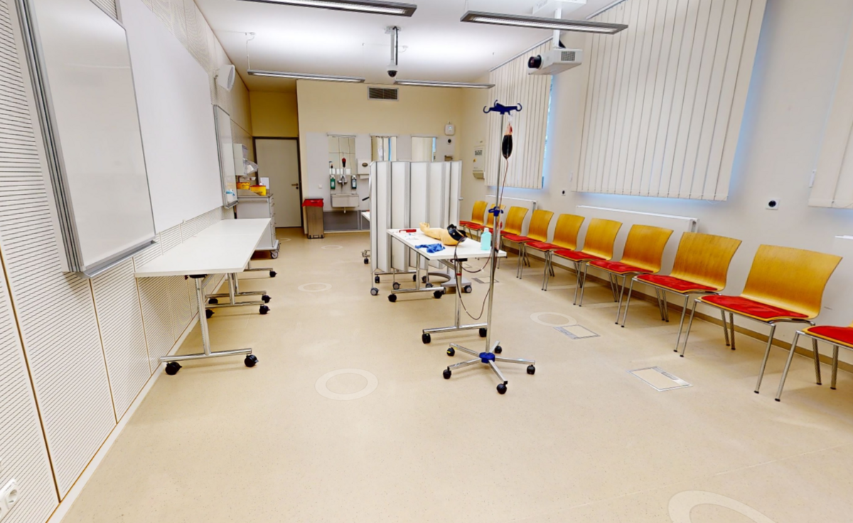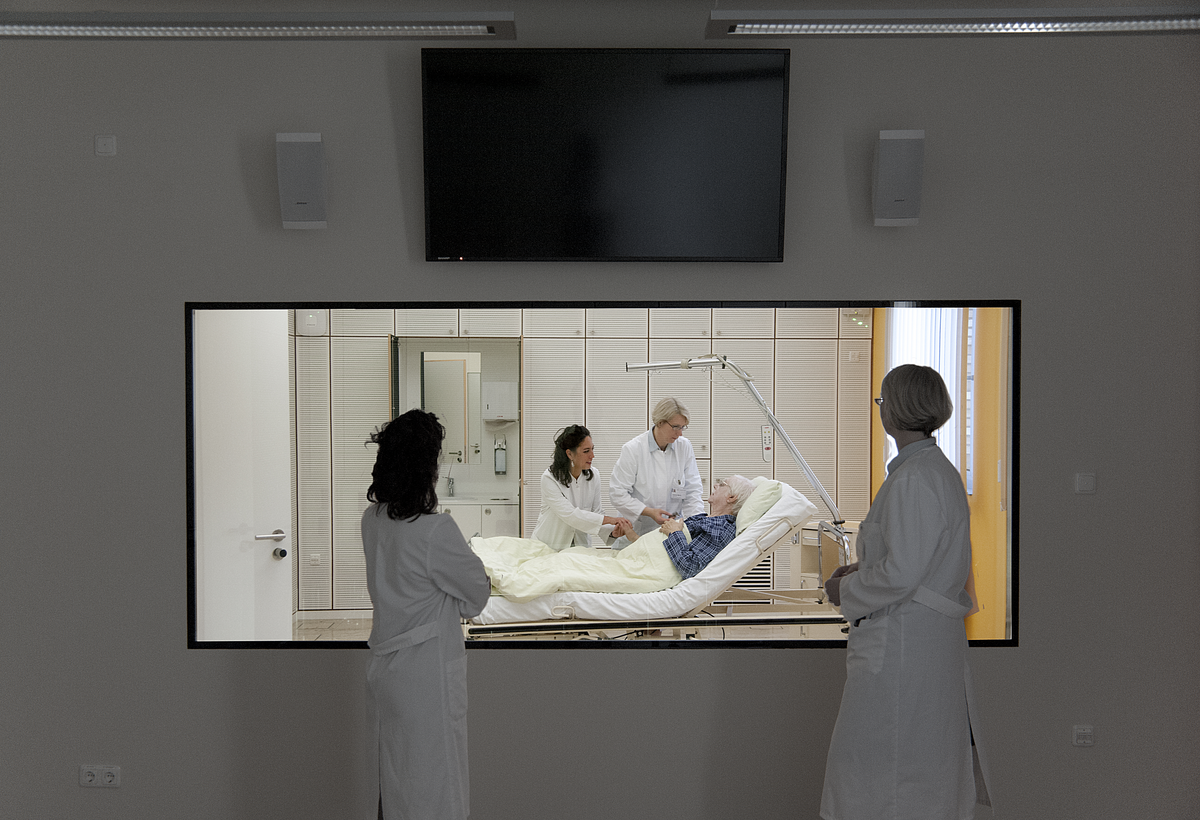 Durch 6 Kleingruppenräume, welche über riesige Spiegel zu 3 Doppelräumen verbunden sind, ist es möglich, realistische Szenarien des klinischen Alltags darzustellen.
